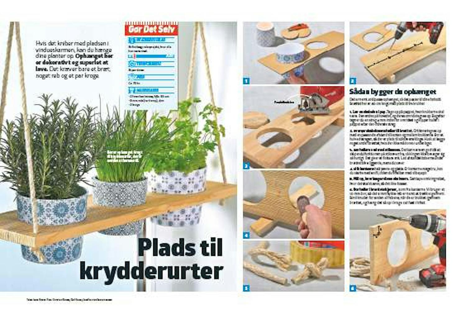 Det er nemt at tilpasse ophænget, så det passer til dine forhold. Brættet her er 80 cm langt med plads til tre krukker.