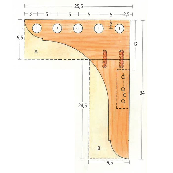 Dette er skabelonen, der er brugt til at tegne hyldeknægtene til hattehylden. Til de fem huller til rundstokkene til hattehylden har vi brugt et 16 mm spadebor. For at undgå, at træet flosser, bores der kun, indtil borets spids lige stikker igennem på bagsiden. Derefter bores fra den anden side. Rundstokkene er 16 mm tykke – samme størrelse som hullerne. Derfor skal hullerne slibes indvendigt, så rundstokkene glider let gennem. Til profileringen har vi brugt et afrundingsjern med kuglestyr (radius: 4,5 og 15,5 mm).