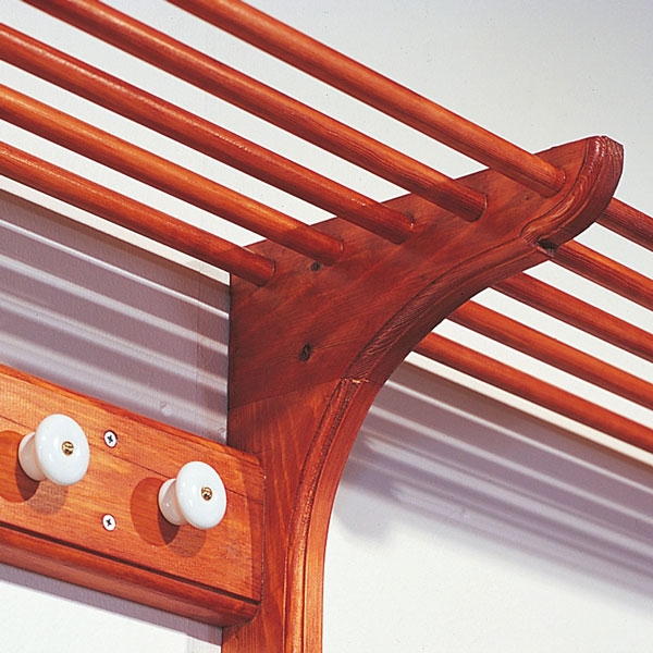 Ved hjælp af en skabelon tegnes hyldeknægtens udvendige kurver. Desuden markeres huller til rundstokkene til hattehylden og til dyvelhullerne i knagebrættet. De udvendige kurver saves med lettest med en stiksav.