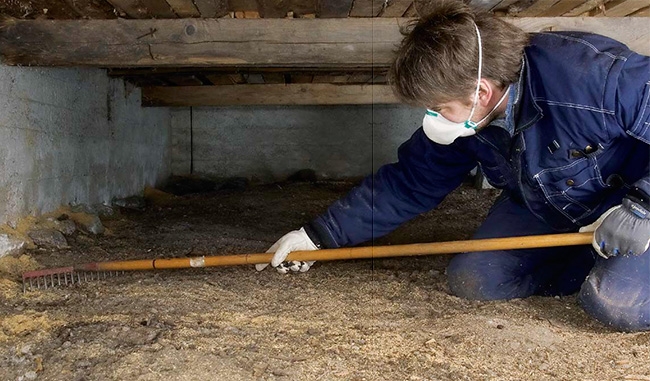 Vi lægger en fugtspærre på jorden efter at have fjernet overfødigt organisk materiale fra krybekælderen.