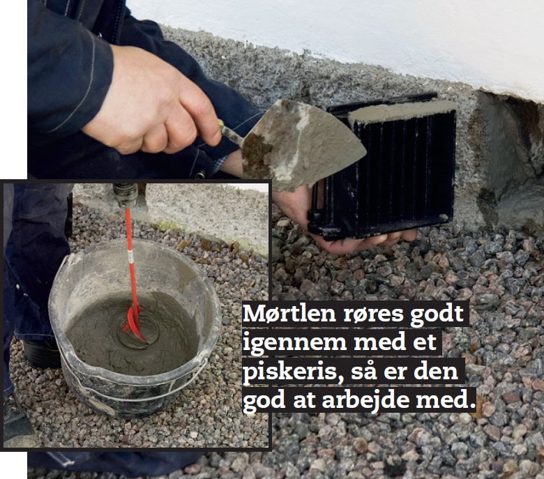 Risten gøres fast i åbningen med mørtel. Brug en mørtel, der svarer til soklen. Kanten i åbningen fugtes, så den ikke trækker vandet ud af mørtlen. Læg mørtel både i åbningen og på risten.