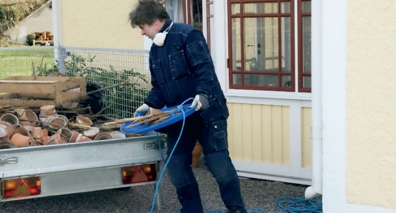 Tingene fjernes rimelig nemt på en slæde med en snor i begge ender - især hvis du har en kammerat til at hjælpe udenfor. Her bruger vi et plastsæde, der egentlig var skabt til at kure ned over snedækkede bakker - der må improviseres.