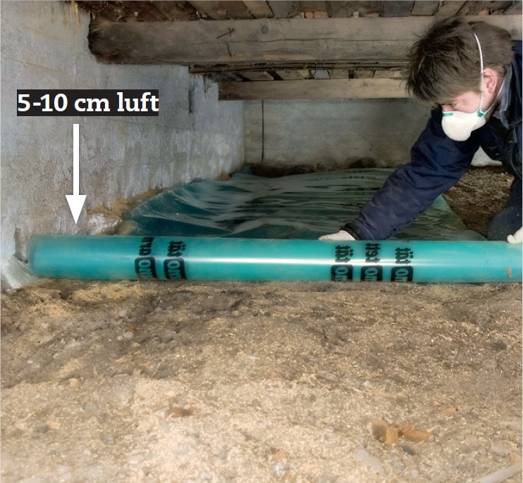 Fugtspærren rulles ud på jorden. Ved soklen holder du 5-10 cm’s afstand, så soklen stadig ventileres, og så eventuelt kondensvand på soklens inderside kan synke ned i jorden.