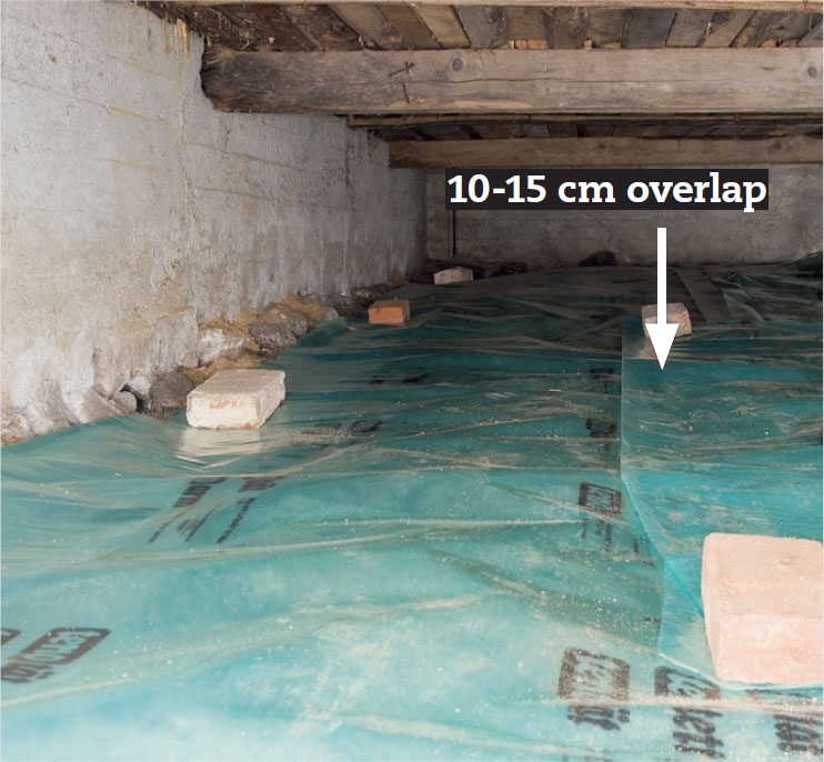 Fugtspærren holder vi på plads med løse mursten. I modsætning til en damp spærre, som skal lukke tæt til alle sider og forhindre al luftgennemstrømning, skal fugt spærren kun bremse fordampning fra jorden op i krybekælderen.