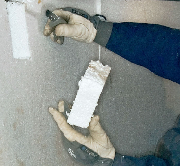 Tag mål på soklens indersider. Her er vi så heldige, at soklen er glat og cirka 60 cm høj, så de hvide isoleringsplader stort set passer i højden. Skal pladerne fæstnes til soklen, bruger du særlige sømdyvler med store skiver, som købes med pladerne.