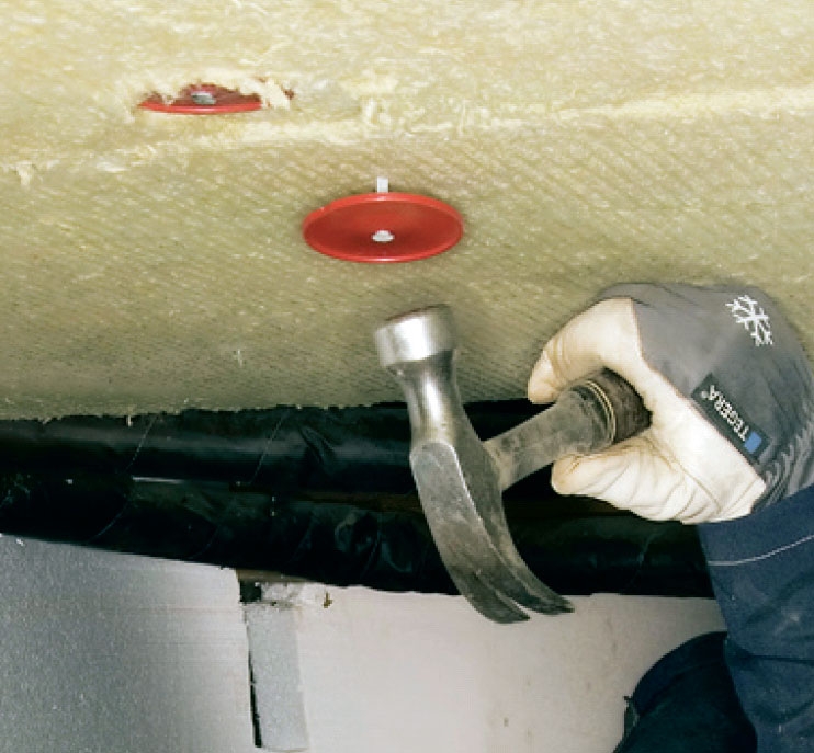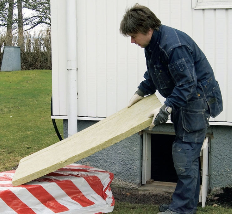 Til isoleringen under gulvet bruger vi en fast plade af mineraluld, Parocs WAS 50. Den er ikke helt så hård som en terrænbatt, men så hård, at den kan sømmes eller skrues op med store plastskiver som hjælp, og så tæt, at den holder vind ude.