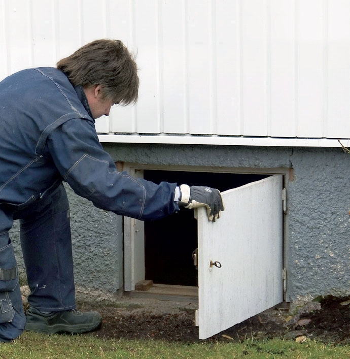 Ved en høj sokkel er der ofte adgang til krybekælderen udefra.