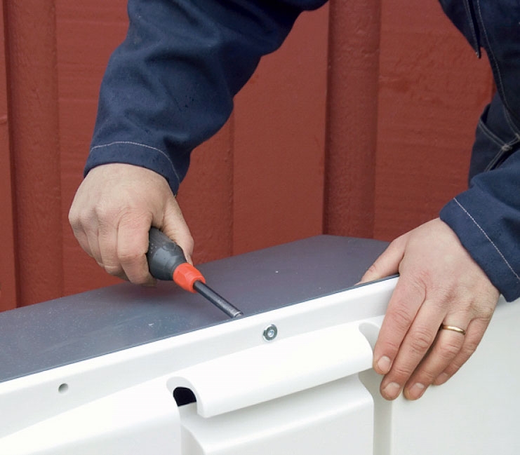 Plastkappen på affugteren gøres fast som vist på dens egne papirer. Samtidig bider du mærke i, hvor filteret sidder - det skal skiftes indimellem, og derfor skal det være nemt at komme til.