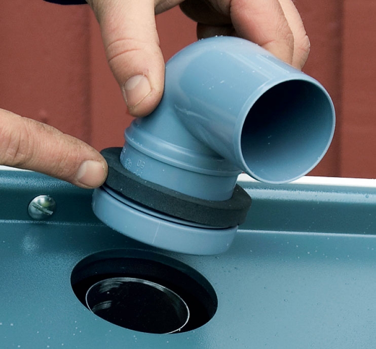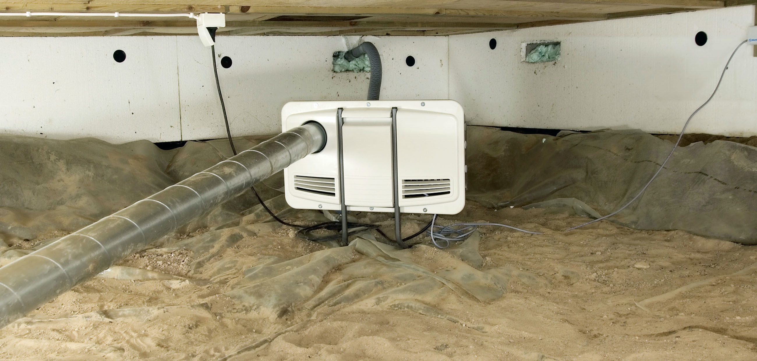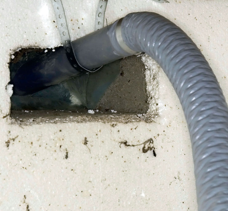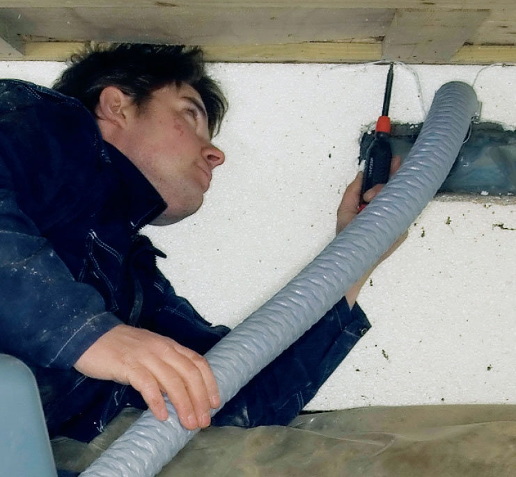 Drænrøret sættes på affugteren. Det skal slutte tæt - det er gennem røret og den bløde slange, affugteren med varm luft som transportmiddel flytter fugten fra krybekælderen ud i det fri.