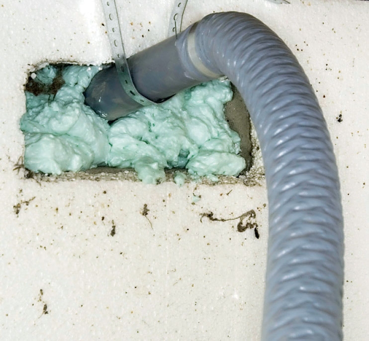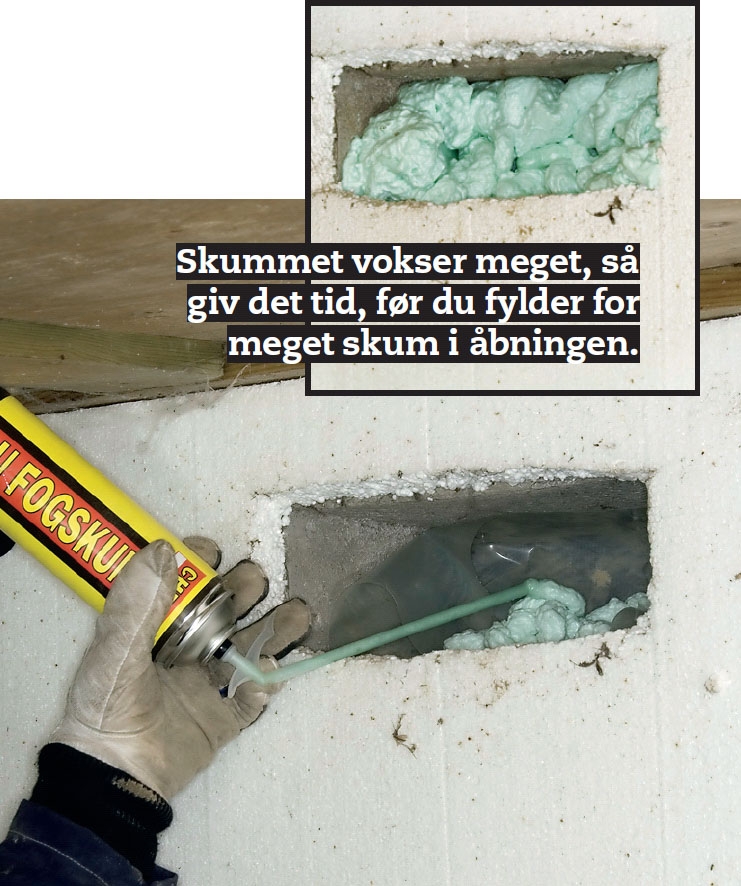 Skum også ud i hullet omkring røret med udblæsningsluften. Plastfolien hindrer skummet i at presse sig ud gennem ristene - og gør det nemmere at fjerne skummet igen, hvis du får andre planer på et senere tidspunkt.