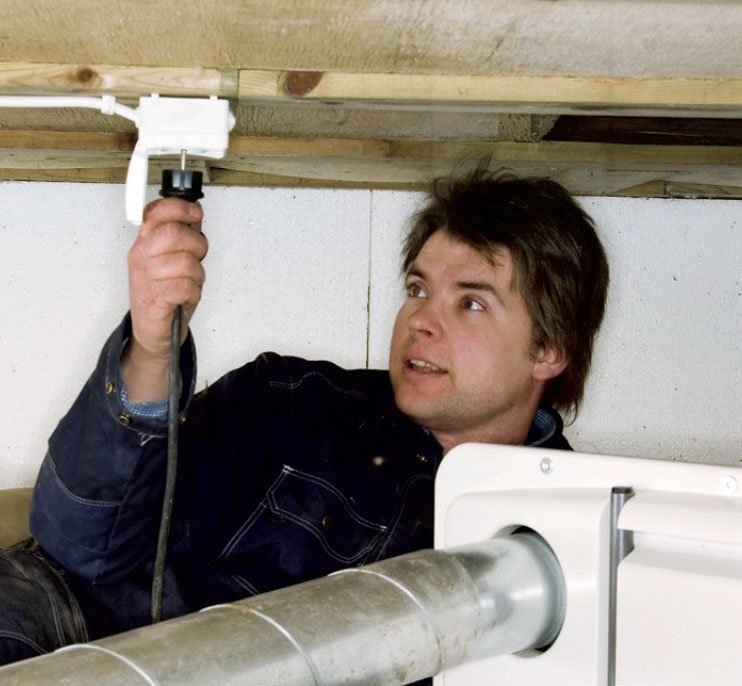 Affugteren står permanent i krybe kælderen. Du kan så vælge, om den skal køre konstant og gardere mod lugt og radon, eller om den kun skal gå i gang, når luftfugtigheden kommer over en bestemt grænse.