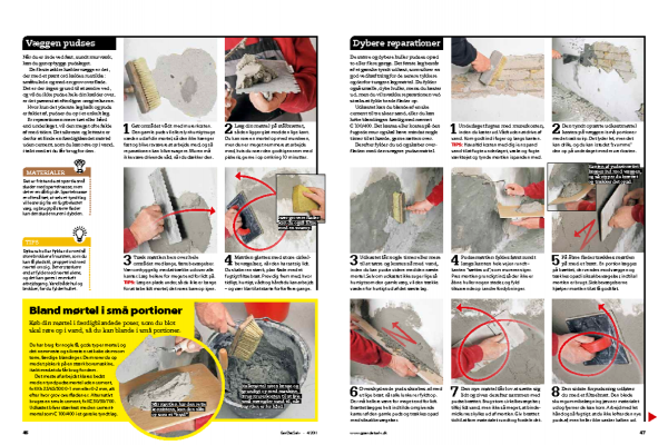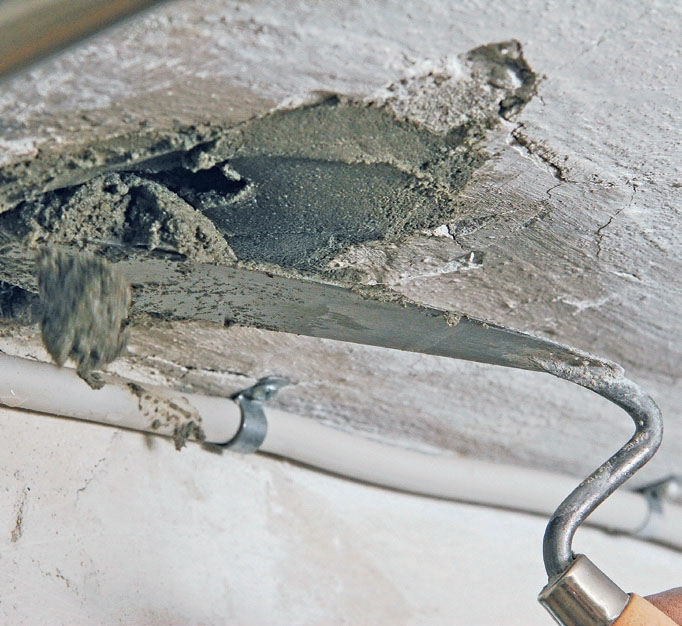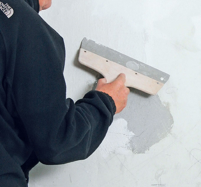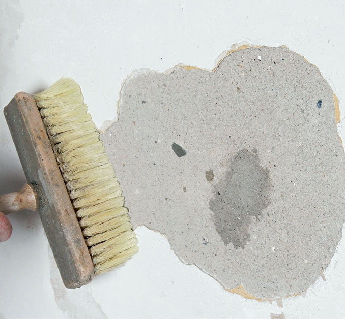 Den grundlæggende teknik fra muren gør stor gavn, og små reparationer kan du klare alene ved at være omhyggelig med at fugte underlaget og kun kaste eller koste tynde lag på først. Når de er tørre, er det meget lettere at få de næste tykkere lag til at trodse tyngdeloven.