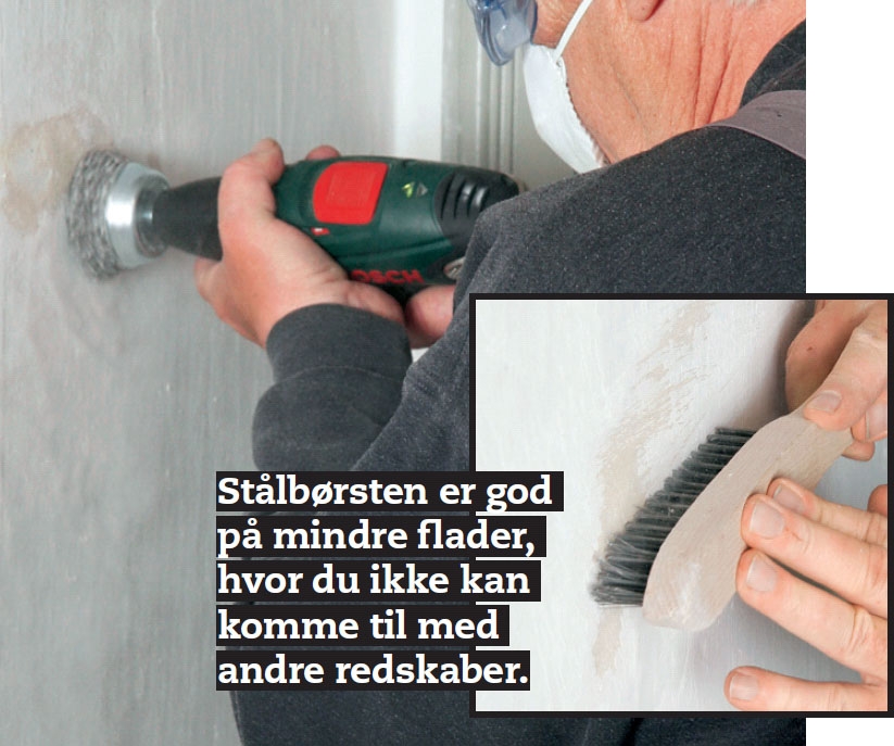 En boremaskine med stålbørste fjerner maling, der er for tæt og må væk - men det støver voldsomt, og du skal dække alt af og pakke dig selv godt ind. På store flader kommer du ofte hurtigt frem med rigtig groft slibepapir, gerne korn 24.