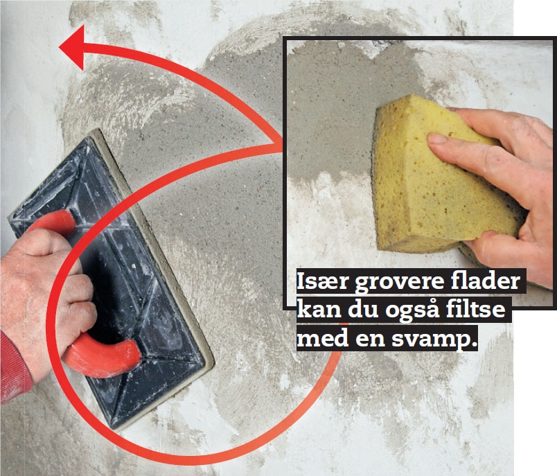 Den nye mørtel får lov at sætte sig lidt og rives derefter sammen med pudsebrættet. Brug store cirkelbevægelser, tilføj lidt vand, men ikke så meget, at bindemidlerne skylles ud af mørtlen. Giv brættet tid til at føre materialet rundt og fordele det.