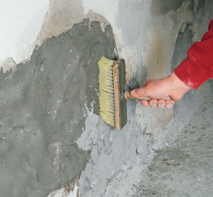 Udkastet kan du blande af en ske cement til tre skeer sand, eller du kan købe blandingen færdig med navnet C 100/400. Det kastes eller kostes på den fugtede mur og skal have mindst nogle timer til at hærde, gerne natten over.
