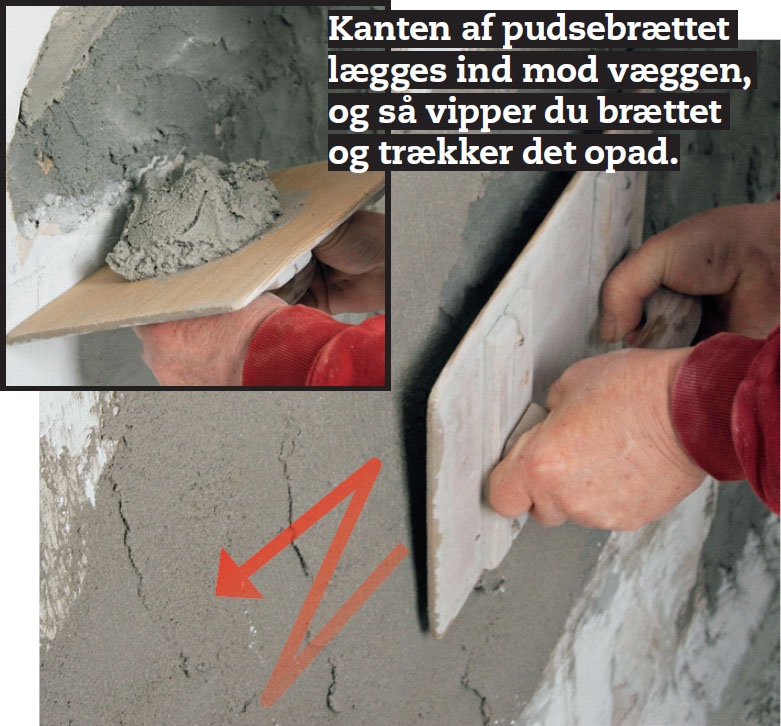Overskydende puds skrabes af med et lige bræt, når alle lunker er fyldt op. Der må hellere være for meget end for lidt. Brættet lægges helt ind til de omgivende kanter af den gamle puds og trækkes opad med siksakbevægelser.