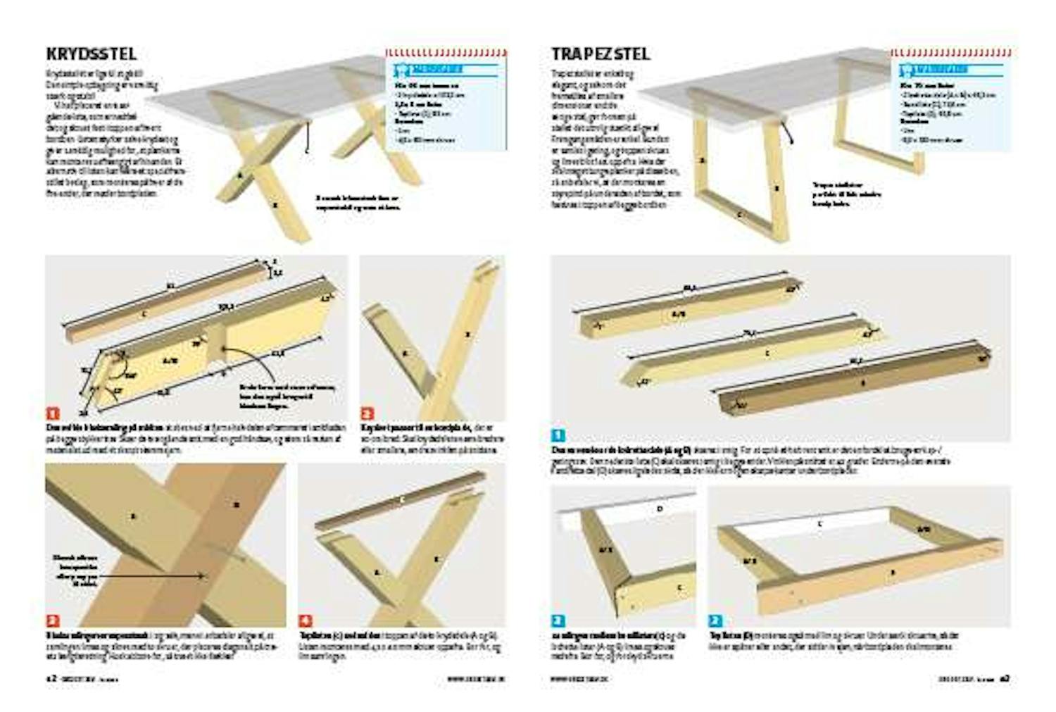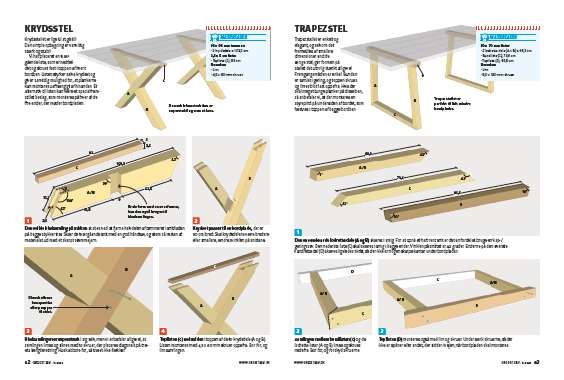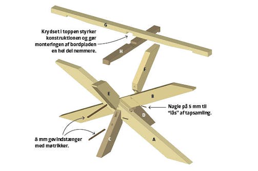 Selve knudepunktet i midten består nemlig af hele fem samlinger, som alle har skæve vinkler. Dertil kommer krydset i toppen, som låser og sikrer stellet, når den tunge bordplade skal på. Vi giver dig hele opskriften, så hvis du er præcis med opmåling og udskæring, så kan det sagtens lade sig gøre.