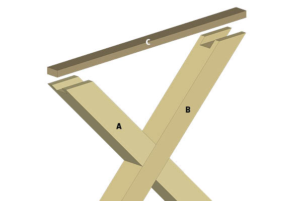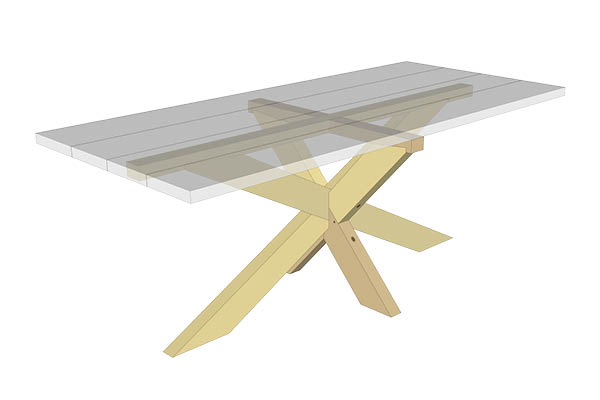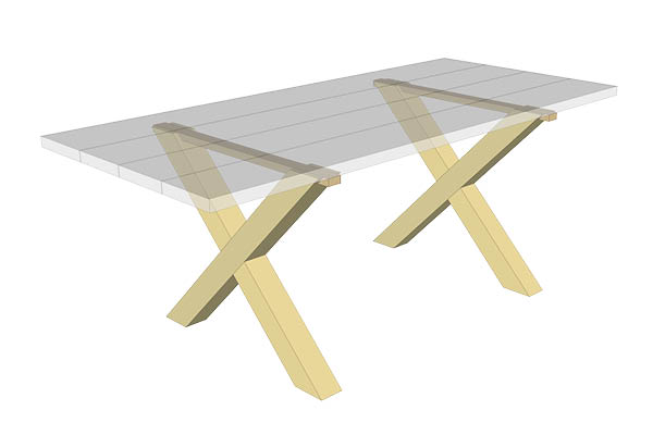 Krydsstellet er lige til at gå til! Den simple opbygning er vanvittig stærk og stabil. Vi har placeret en tværgående liste, som er nedfældet og skruet fast i toppen af hvert bordben. Listen styrker selve krydset og giver samtidig mulighed for, at plankerne kan monteres uafhængigt af hinanden. Et alternativ til listen kan være et specialfremstillet beslag, som monteres på hver af de fire ender, der møder bordpladen.