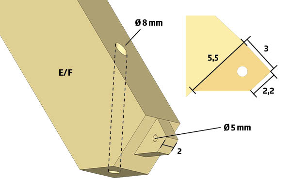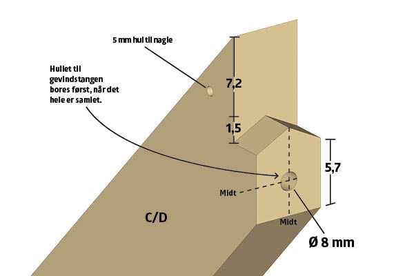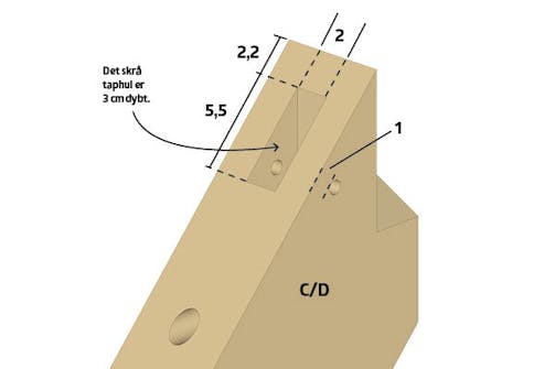 På oversiden af krydsdel C og D laves et taphul. Taphullet skal have samme mål som den skrå tap på krydsdel E og F.