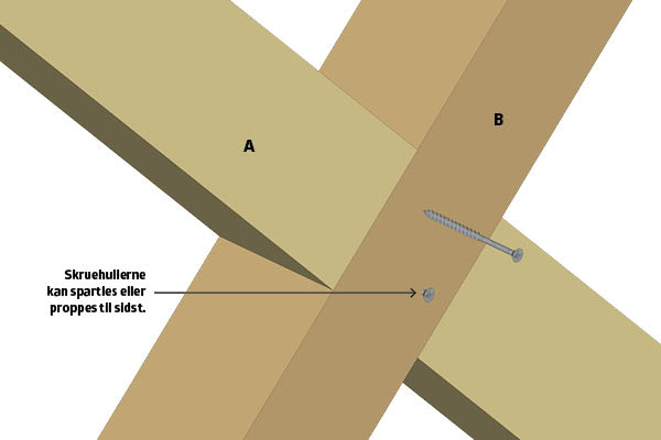 Bladsamlingen er superstærk i sig selv, men vi anbefaler alligevel, at samlingen limes og sikres med to skruer, der placeres diagonalt på træets længderetning. Husk at bore for, så træet ikke flækker.