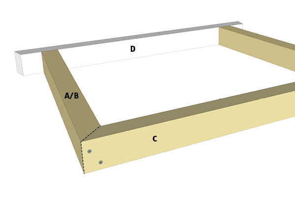 Den ene ende af de lodrette dele (A og B) skæres i smig. For at opnå et helt rent snit er det en fordel at bruge en kap-/ geringssav. Den nederste liste (C) skal skæres i smig i begge ender. Vinklen på snittet er 42 grader. Enderne på den øverste vandrette del (D) skæres ligeledes skråt, så der ikke er nogen skarpe kanter under bordpladen.