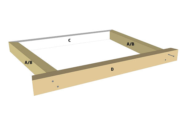 Samlingen mellem bundlisten (C) og de lodrette lister (A og B) limes og skrues nedefra. Bor for, og forskyd skruerne.