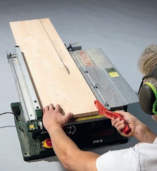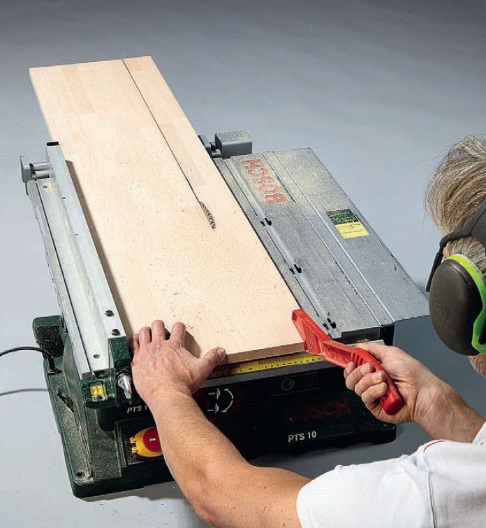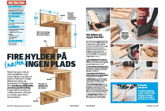 Hjørnereolen bliver bygget af to hylder på 30 x 120 cm, som her saves til på en bordrundsav, da det er billigst i materialer. Har du ikke en bordrundsav, kan du vælge en hylde med en bredde på 23,5 cm. Så skal den kun skæres på den korte led. Det gøres fx nemt med en rundsav. Du kan også bygge en bredere reol, hvor alle sider er 30 x 30 cm. I så fald skal du bruge tre hylder a 120 cm.