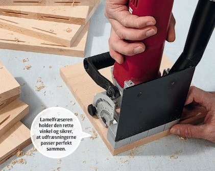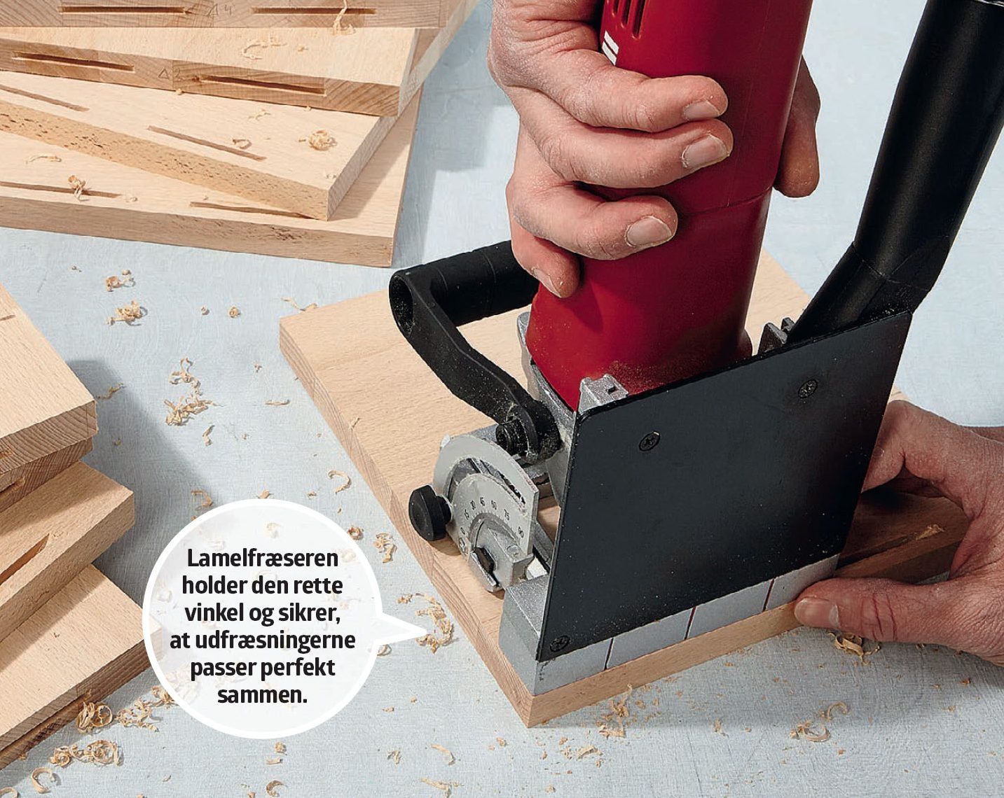 Fræs ud til fiskene med lamelfræseren, først på siderne af de fire vandrette hylder. Har du ikke en lamelfræser, kan du se et alternativ i den blå boks.