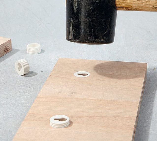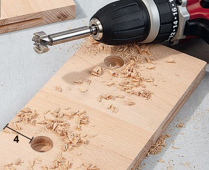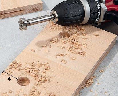 Bor ud til ophængsbeslag på top- og bundstykket med et passende forstnerbor. Beslaget bør sidde omkring 4 cm fra kanten. Pas på, du ikke borer hele vejen igennem. Kan du ikke finde de viste beslag, kan du se et alternativ på næste opslag.