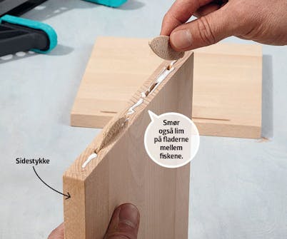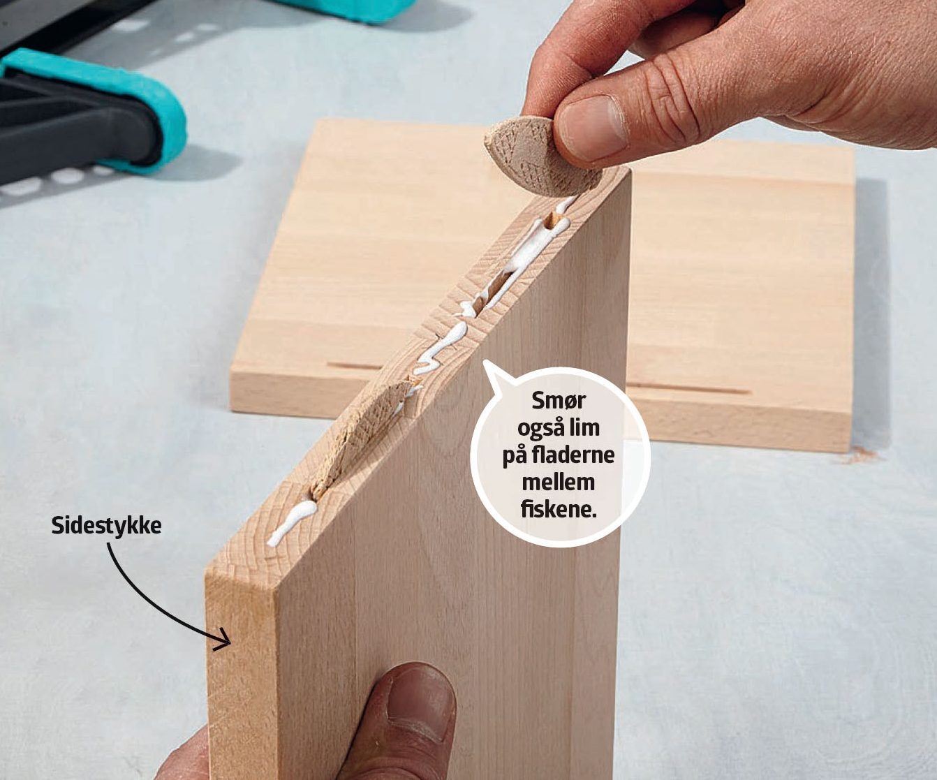 Put lim og fisk i udfræsningerne på en af de lodrette sidestykker med udfræsninger i enden. Der skal også lim på fladerne mellem fiskene og i udfræsningerne på de to vandrette hylder, som siden samles med.
