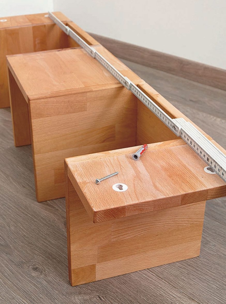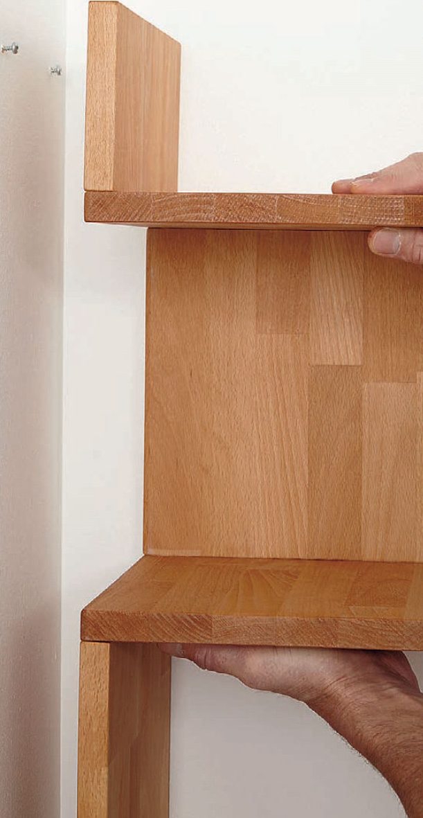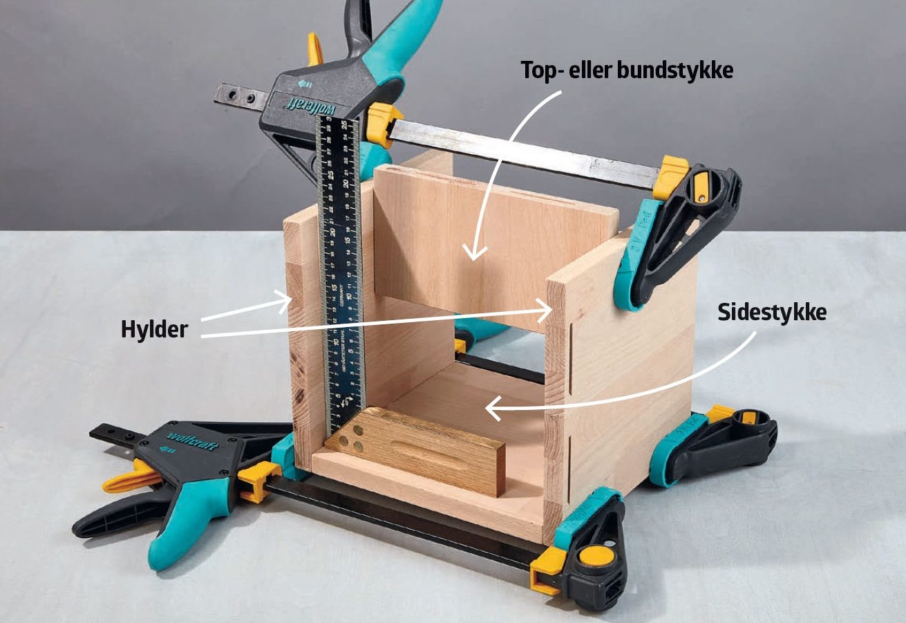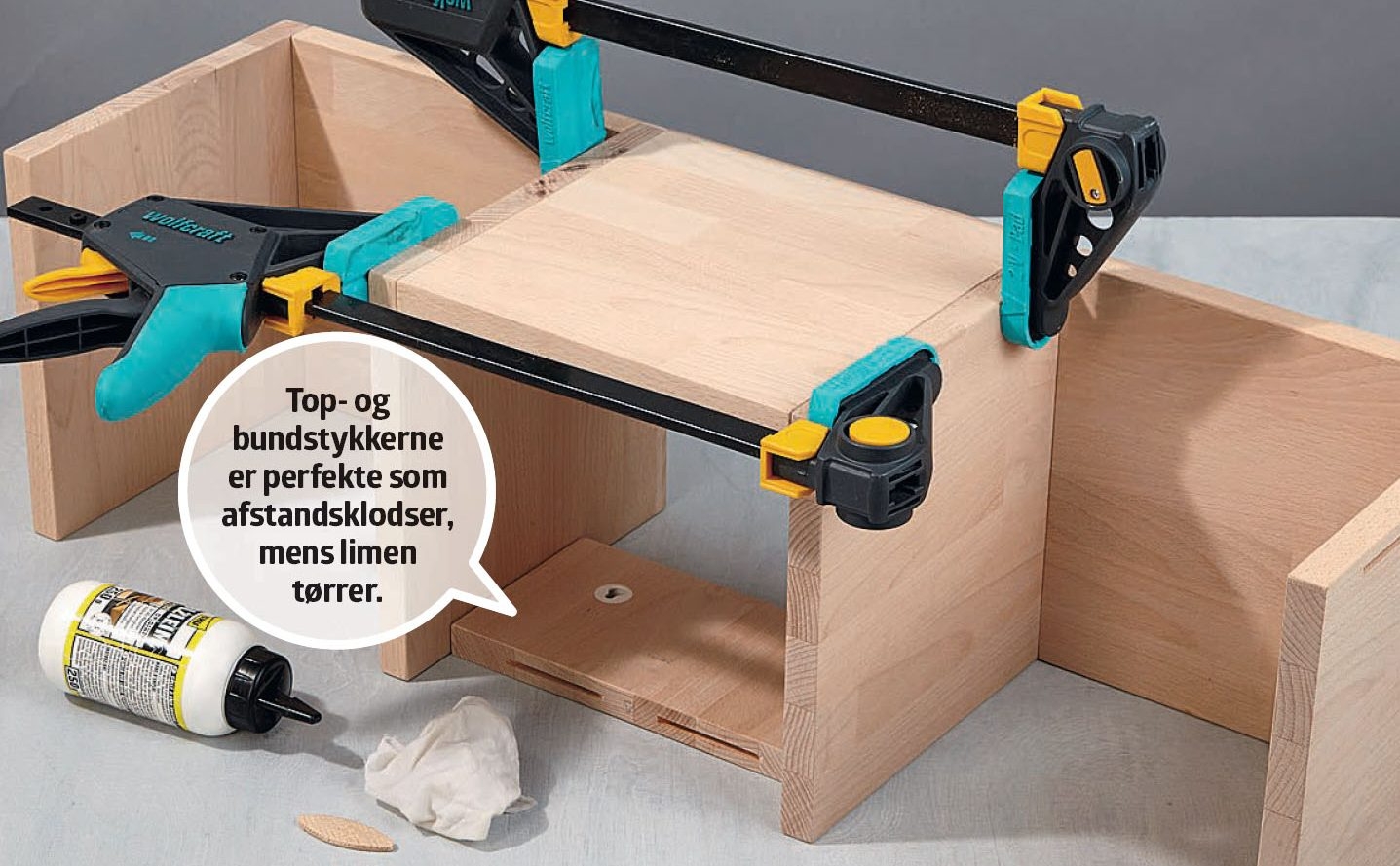 Start med at samle den første “kasse”. Brug et top- eller bundstykke til at holde den rette afstand mellem hylderne. Så er reolen nemmere at tvinge sammen, mens limen tørrer.