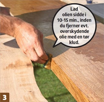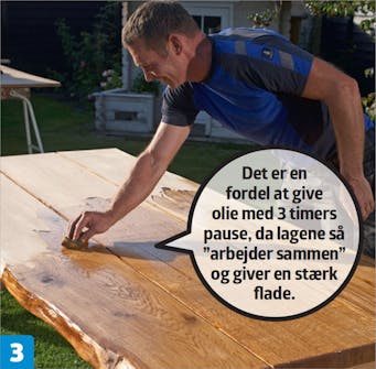 Overfladebehandlingen af bordpladen er vigtig, specialt når dit bord er til udendørs brug. Vi har valgt en olie beregnet til gulve, Bona Decking Oil. Den kan ikke købes i byggemarkedet, men fås gennem en gulvforhandler, og giver en meget stærk overflade.