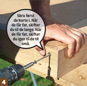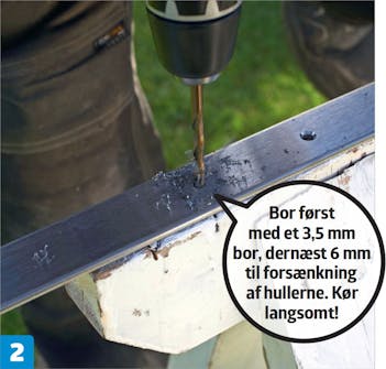 Her bores ekstra huller i skinnerne, så der kan sættes to skruer i hver planke. Det er vigtigt, da skruerne tager spændingen af træet, så du ikke risikerer, at plankerne flækker. Brug bor af rustfrit stål.