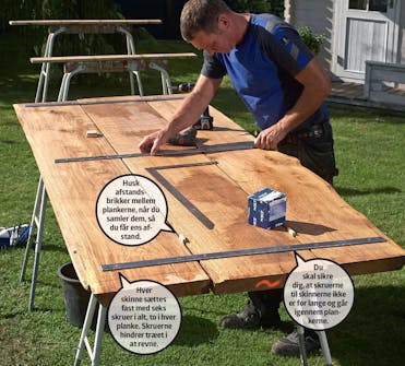 Mål op til skinner på bagsiden af bordet. Her skal placeres tre skinner, en i hver ende og en på midten. Husk at lægge afstandsklodser mellem plankerne, så mellemrummene har ens størrelse, fx 9 mm.