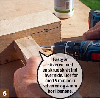 Sæt smigsamlingen sammen, og bor for gennem de forborede huller ned i selve benene. Hold godt sammen på delene, mens du borer. Smør bagefter udendørs trælim på den skrå flade, inden du skruer fast.