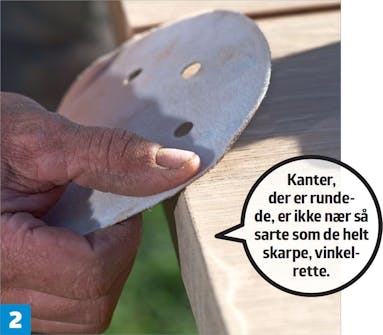 Slib kanterne med en excentersliber, og lad den følge træets struktur. Slib i flere omgange, og giv dig god tid. Her kan du virkelig kæle for detaljen. Start med korn 60-80, og slut med 120. Bevæg hele tiden sliberen.