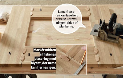 Bordpladeplankerne (A og B) samles ved hjælp af såkaldte fisk. Med en lamelfræser laves en lille rille, hvor træet skal samles. Heri limes de små fisk, som på den måde holder rammen sammen. Vi bruger to fisk i hver samling.