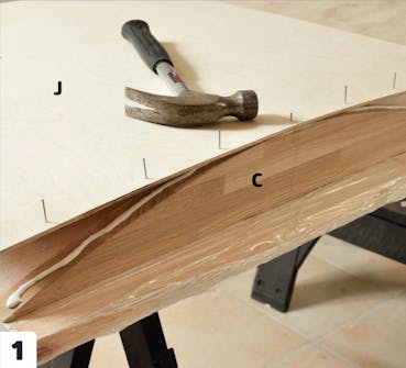 Bundpladen (J) monteres på sargdelenes (C) buede side med lim og 1,2 x 20 mm dykkere. Du kan efterfølgende runde bundpladens hjørner med slibepapir.