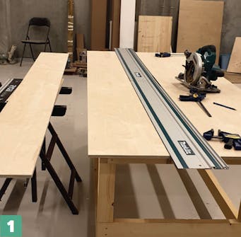 Skær pladen til. Det er en god idé at lave pladen ca. 5 cm i overmål i forhold til kasserne - både i højden og i bredden. En dyksav med føringsskinne er perfekt til de lange snit.
