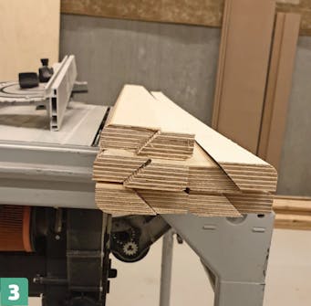 Skær listerne. I første omgang skæres de af i en højde på 6,5 cm. Herefter rundes de på to af kanterne. Det er nemmest at gøre, inden de om lidt skal deles i to skrå lister.