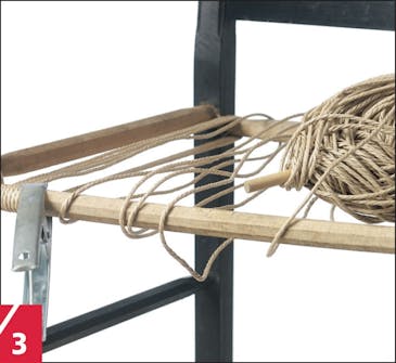 Når det enkelte felt, fx 15 omgange, er nået, vikles nogle gange rundt om sargen, så du får et mellemrum mellem felterne. Klemmen holder på det øvrige flet. Nøjes du med blot at vikle to omgange, får du et helt andet resultat - se forrige opslag.