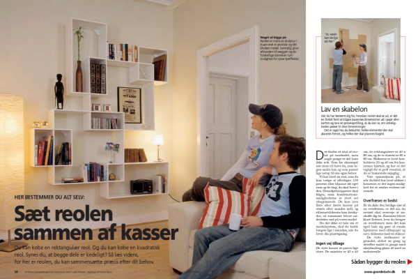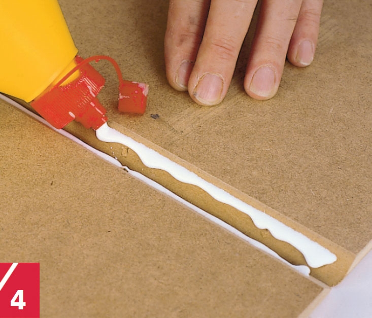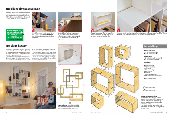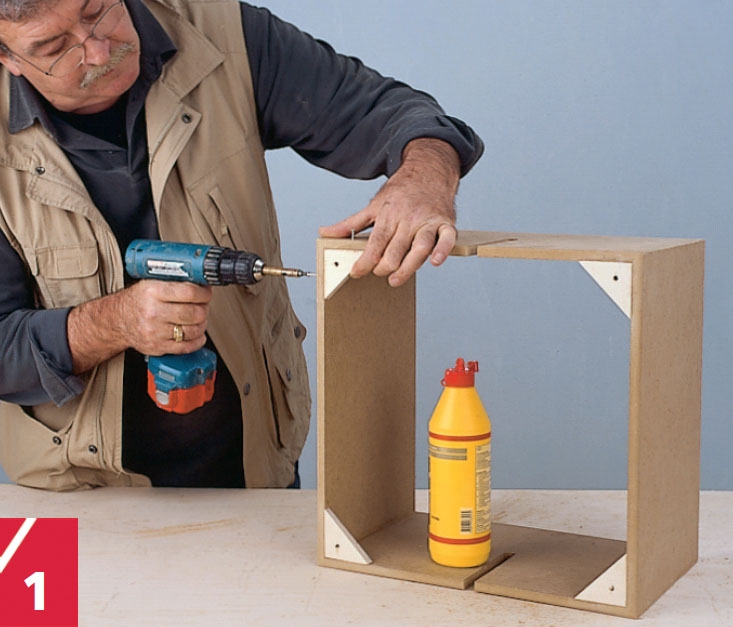 Hver reolkasse består af fire sider, der samles på gering (snit på 45 grader) i hvert hjørne med snedkerlim og seks 3 x 30 mm skruer. Du skal bore for til skru-erne for at undgå, at træet flækker, og skruerne skal undersænkes.