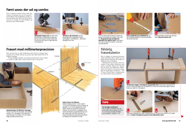 Skabelonen kan du lave af for ek-sempel 6 mm plade. Slidserne skal saves i korrekt afstand fra hjørnet (her 20 og 40 cm). Slidserne i skabe-lonen er så brede, at de passer nøjag-tigt til kopiringens diameter - her 17 mm. Et par lister i skabelonens ene ende holder den mod hjørnet.