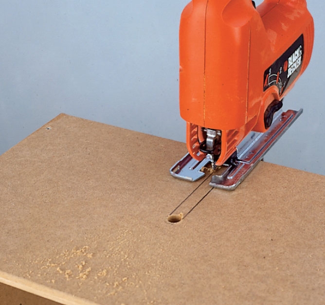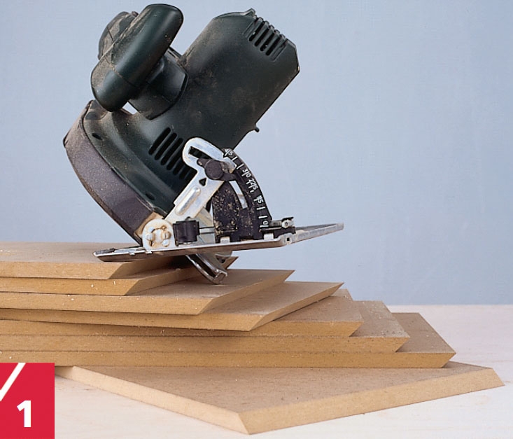 Mdf-pladen skæres ud, her med rund-eller bordsav. Endekanterne skæres på gering. Ved brug af rundsav skæres der mod et fast land, altså et lige bræt eller en retteskinne.