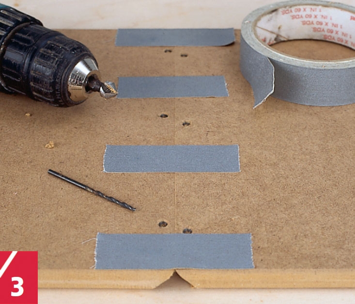 Det kan være drilsk at samle et hjørne på gering, fordi fladerne let glider i den våde lim. Brug derfor tape på hjørnets yderside til at fiksere med. Læg mærke til, at der er boret for med et 1,5 mm bor og undersænket.