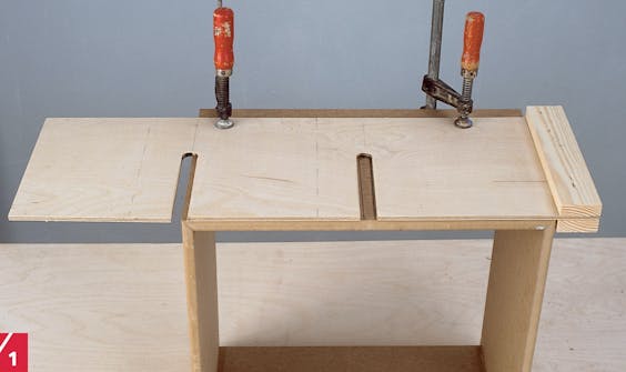 Skabelonen lægges mod hjørnet og spændes fast med tvinger. Læg mærke til, at der er lister på begge sider af skabelonen, så den kan vendes og bruges til præcis fræsning i både for- og bagkant.