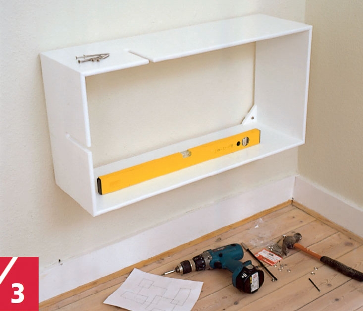 Kasserne skrues fast på væggen gennem små trekantede finérstykker, der placeres i hvert hjørne i plan med bagkanten. Mdf er ikke robust nok i dette tilfælde, så i stedet bruger vi 12 mm krydsfinér.