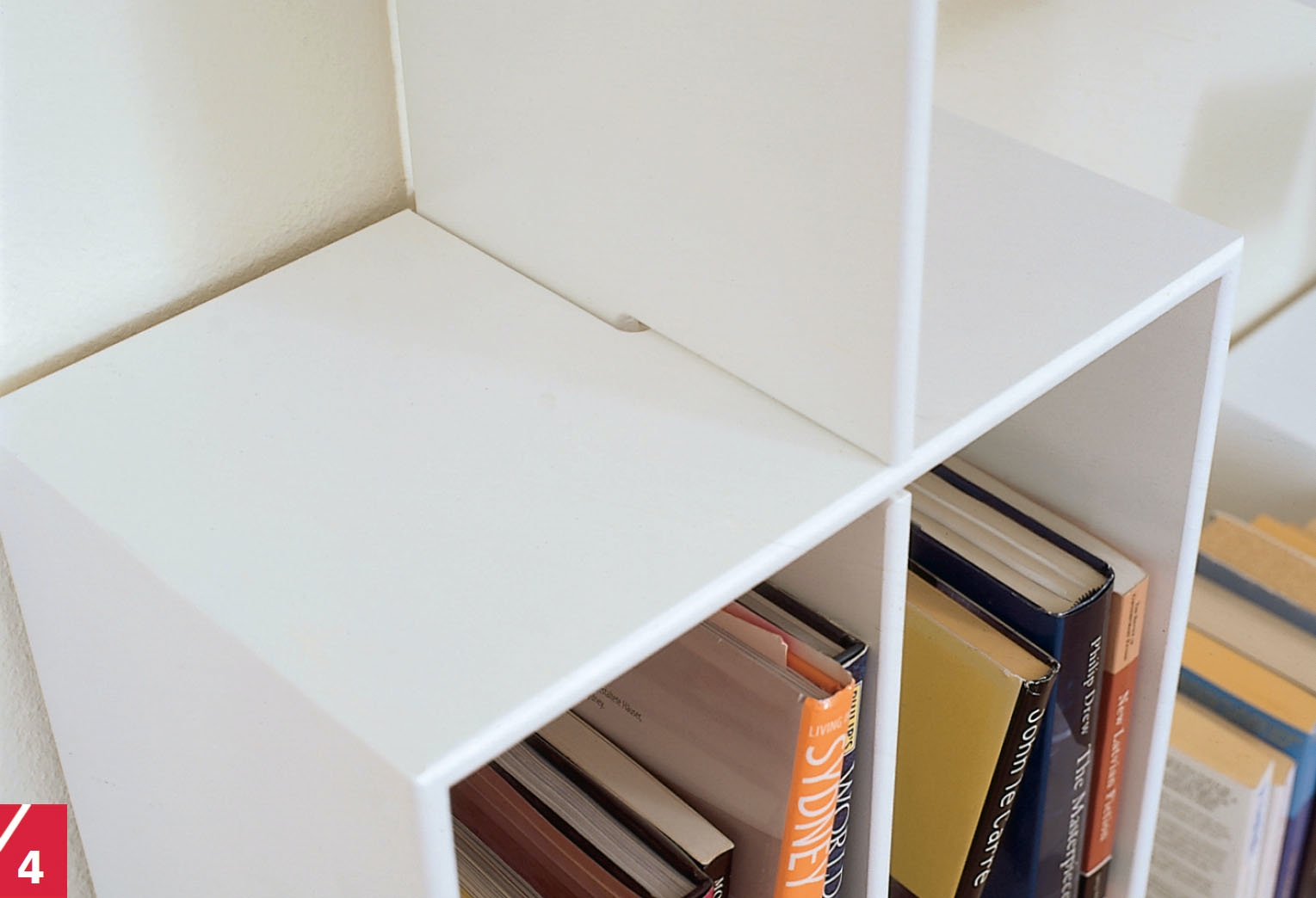 Reolen bliver “lettere” at se på, når du placerer en 12 mm rondel mellem trekant og væg. Det giver også mulighed for at få en ledning til fx en lampe ind bag reolen.