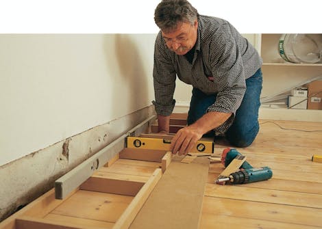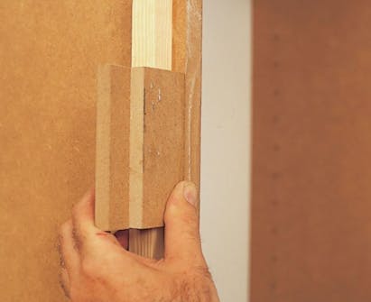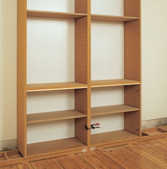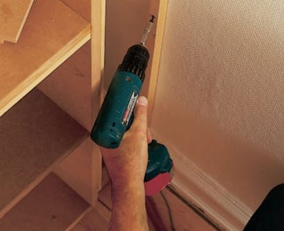 Inddækningen skal flugte præcist med reolens forkant. Lav en såkaldt “ko” til opmærkning, og fastgør listen præcist langs opmærkningen.