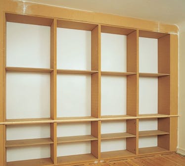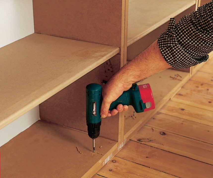 For at skjule den uundgåelige samling af de enkelte moduler – og for at slippe for at skulle spartle overgangen – monterede vi en profilliste, svarende til bredden på siderne på de to moduler. På samme måde har vi anvendt skjulte hængsler med 90 graders åbningsvinkel til lågerne, så disse kan sidde helt tæt til reolen.